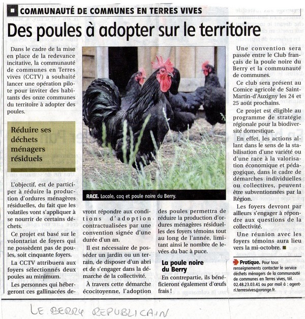 | Des poules noires à adopter sur le territoire | Le Berry Républicain | 27 juillet 2013 |  |