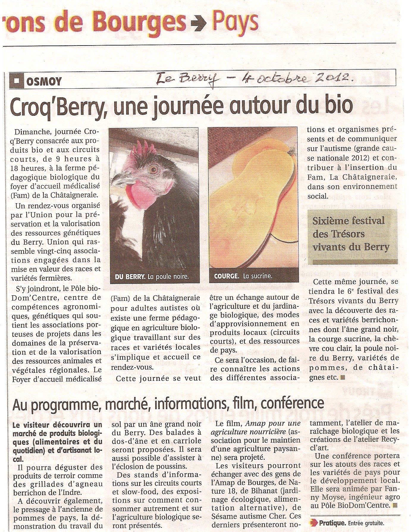 | Croq'Berry, une journée autour du bio | Le Berry Républicain | 4 octobre 2012 |  |
