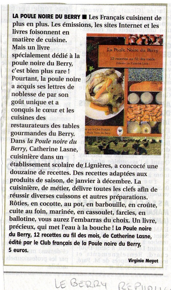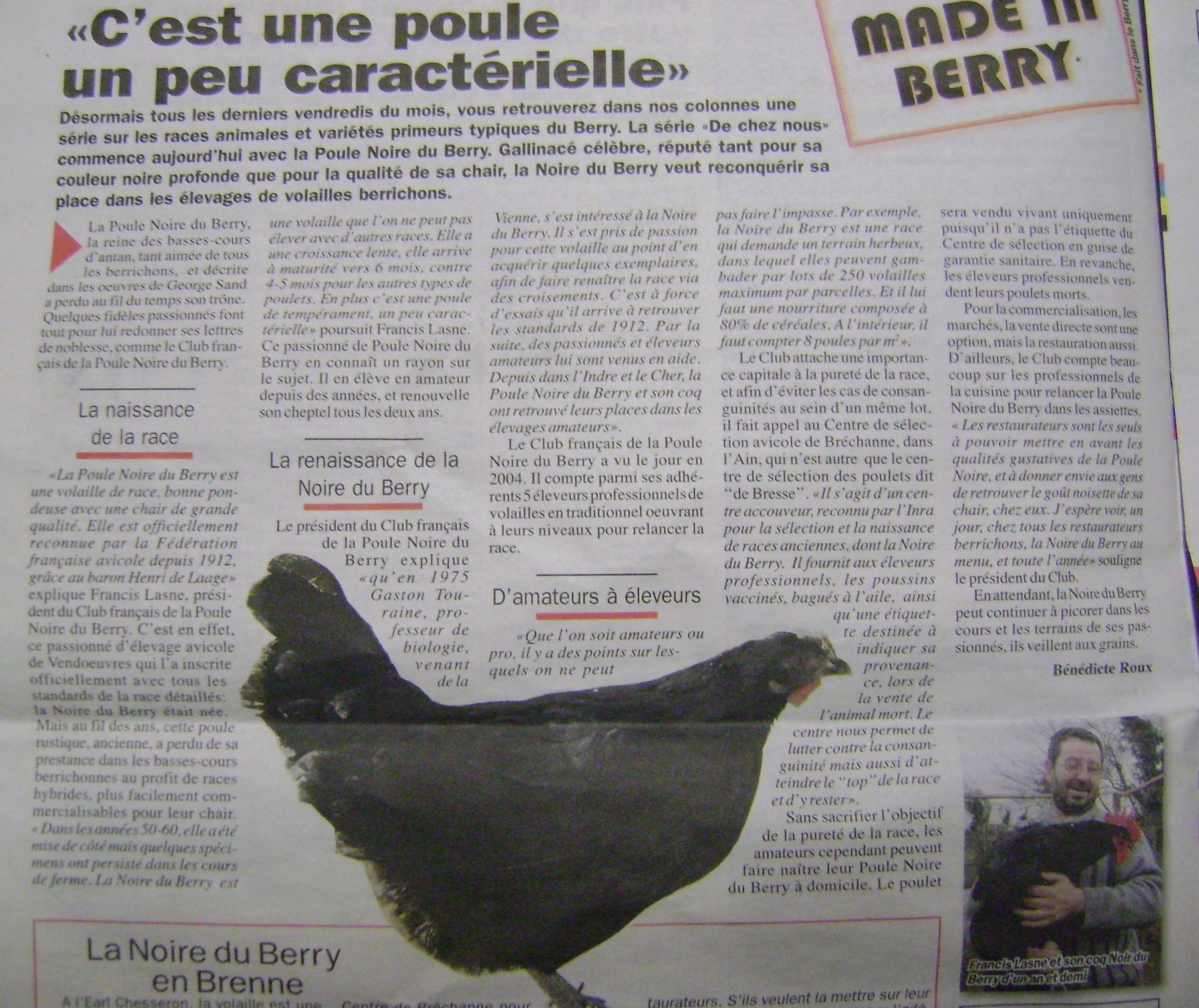 | Réhabiliter la poule noire du Berry | Le Berry Républicain | 13 septembre 2012 | Lien |